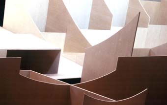 Wenn Rolf Wicker seine Arbeiten gerne im Kontext des skulpturalen Arbeitens sieht, so ist eine derartige Einordnung und Kategorisierung zwar möglich, aber gleichzeitig eine begriffliche Verhüllung, die die konzeptionelle Tiefe und Bedeutung des Sichtbaren verbirgt. In der Tat lassen sich die installativen Arrangements sowohl in Innen- als auch Außenräumen als großflächige und –räumige Skulpturen sehen, die deren wesentliche Momente, wie den dreidimensionalen Raumkörper, Formung und plastisches Gestalten aufgreifen. Auffällig ist jedoch der stark architektonische Zugriff der Arbeiten, mit dem nicht allein ein Körper in den Raum gesetzt wird, sondern der Raum selbst wiederum als Innen- und Leerraum thematisiert wird. In Differenz zum plastischen Gestalten als einem Verfahren der Montage, um einen Körper zu erzielen, fallen hier Momente des Bauens ins Gewicht. Von der Architektur selbst differenzieren sich die Arbeiten durch ihr auffälliges Größenverhältnis: zu klein für eine tatsächlich zu benutzende und zu belebende architektonische Hülle einerseits, zu groß für eine Vorformulierung eines als Bauwerk umzusetzenden Modells andererseits. Hinzu kommt, daß sich die meisten dieser installativen Arrangements auf bereits existierende Architektur zurückführen lassen, die aber ihren ursprünglichen Zusammenhängen entrückt, gar ent- und verfremdet werden, um zu einem ganz eigenständigen Komplex sich zu wandeln. Zu dieser entschiedenen Uneindeutigkeit der Zuordnung tritt nun die bewußte strategische Dialektik von Verwirrung und Entwirrung. Die Installationen lassen sich aus der Sicht des Betrachters als Erlebnisräume bezeichnen, die seine erhöhte Aufmerksamkeit und Anspannung einfordern, um einem labyrinthartigen Geheimnis auf die Spur zu kommen, daß in diesen Arbeiten enthalten ist. Zugespitzt ereignet sich hier eine theatralische Magie, die sich nicht nur in formaler Hinsicht, sondern auch in inhaltlicher Komplexität als ein Bastard theatralischen Bauens und der szenischen Kulisse bezeichnen lässt. Insofern betreibt Rolf Wicker einen raffinierten, teilweise ironischen, aber auch bedrohlich abgründigen Budenzauber, der die Bude insofern in den Mittelpunkt rückt, indem er das installative Zusammenspiel in die Bude des Ausstellungsraumes setzt und darin wiederum die Bude selbst ausspielt als gebaute Zusammenführung von Zimmern, Räumen, Gängen und Kavernen. Die Installation „Burgbesichtigung“ aus dem Jahr 2002, für den Friedrichsbau in Bühl entstanden, greift die Grundstruktur einer mittelalterlichen Schlossanlage auf. Wie ein grandioses Bühnenszenario breitet sich die Anlage aus sprödem Gipskarton in der gesamten Mittelfläche des Ausstellungsraums aus. Der Einblick ist dabei nur von den umlaufenden Seitengängen möglich, die Betrachter werden buchstäblich in die Rolle eines Auditoriums gedrängt, das einer möglichen Aufführung von den Seitenrängen aus beiwohnen wird, die in diesem gleichsam konkreten wie anonymen Szenario stattfinden wird. Die „Burgbesichtigung“ verweist den Betrachter in den engen Rahmen einer streng strukturierten Führung, die nur von der Peripherie aus möglich ist, ohne ins Zentrum des gebauten skulpturalen und historischen Raumes vorzudringen, wie dies auch für eine wirkliche Burgführung gilt, die sich immer am Rande der einstigen Lebensbereiche bewegt ohne diese tatsächlich lebendig werden zu lassen. Mit dem Blick von der Höhe der Empore blicken wir in die aufgerissene Struktur der Burgfläche. Wie mit einem präzisen chirurgischen Schnitt erhalten wir Einblick in Kavernen, Unterstände, Kemenaten, Turmaufgänge, Wohn- und Lagerräume und winklige Treppenführungen, die zu Beobachtungsposten im Nirgendwo führen. Das historische Stück, das in diesem seltsamen Szenario aufgeführt werden könnte, bleibt uns ebenso verborgen, wie auch die reale historische Topografie der Struktur sich verschließt. Daß es sich hierbei um eine Schlossanlage handeln könnte, obliegt dem Eindruck des historischen Gedächtnisses des Betrachters, der auf seine Kenntnisse von besichtigten Burganlagen zurückgreifen kann, um das Gemeinte nachzuvollziehen. Was vom feudalen Traum aus Stein und Glas übrig bleibt ist eine dreidimensionale Skizze hauchdünner Wände, eine Zeichnung im Raum, plastische Umsetzung der zugrundeliegenden Grundrißzeichnung, die dem Erstaunlichen einer historischen Architektur Rechnung trägt, diese aber in ein Modell eines nüchtern kalkulierten Bauens mit industriellen Fertigwänden umformuliert. Wie auf der Bühne wird hier nicht gebaut, sondern geklebt. Das Geklebte und Montierte, der Budenzauber bewirkt wie auf dem Theater jene Magie der Illusion, die uns Einblick in eine Welt gestattet, die nicht die wirkliche ist und dennoch als eine Form der Wirklichkeit funktioniert. Die Welt der Installation, die in vielem der Welt des Theaters gleicht, verleibt sich den Betrachter buchstäblich ein, wenngleich er nicht Teil dieser künstlichen Welt sein kann. Insofern bleibt der Betrachter auch aus der Installation Rolf Wickers ausgesperrt, ist gezwungen an der Peripherie zu verharren und begegnet dem künstlichen Szenario mit der unerfüllten Lust, den verbotenen Raum des Historischen zu betreten. Wenngleich das Zentrum nicht betreten werden kann, wird der Blick von der Peripherie doch von diesem beherrscht und der Raum neu definiert. Obwohl der Grundriss, der dieser Installation zugrundeliegt, Zeichnung und damit Bild ist, bedarf es der dreidimensionalen Umsetzung, damit der Budenzauber als Raumbeherrschung und Einverleibung des Betrachters funktioniert. Über die Strategie der Dreidimensionalität schreibt der russische Installationskünstler Ilya Kabakov in seiner Vorlesungsreihe „Über die totale Installation“: „Dreidimensionalität bedeutet die prinzipielle ‚Geschlossenheit‘ der Installation im Gegensatz zur ‚Offenheit‘ der älteren Genres. In der Tat hatte der Betrachter des Freskos, der Ikone und des 